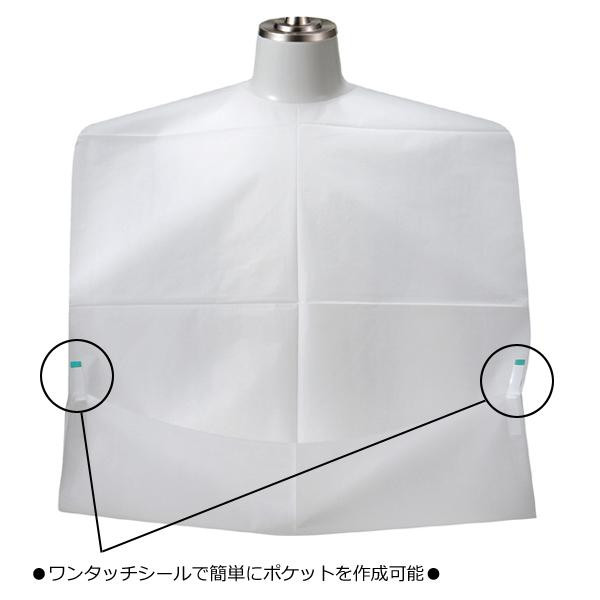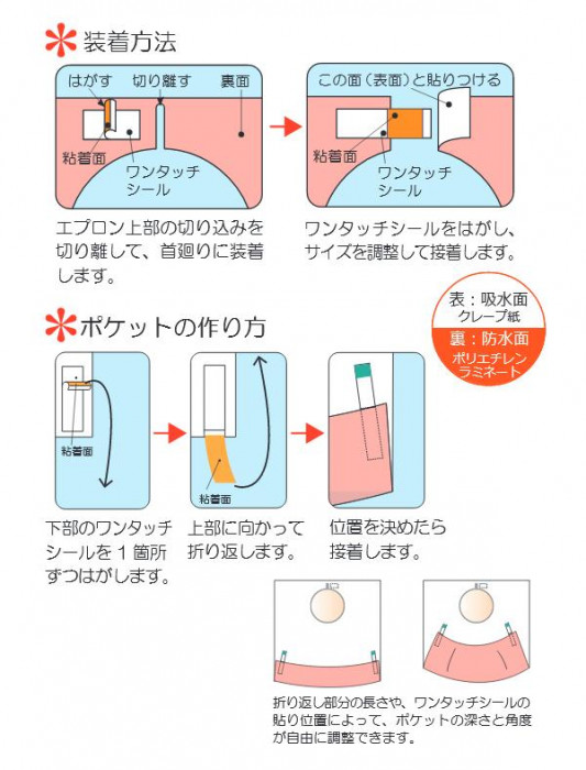 洗濯不要なディスポーザブル(使い捨て)エプロンです。ワンタッチシールで簡単にポケットを作成可能。用途やシーンに応じて使い分けできます。