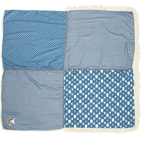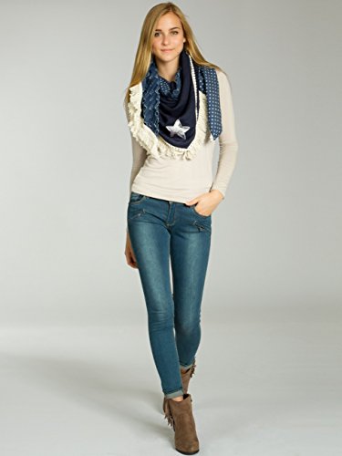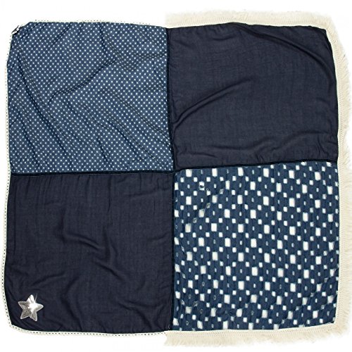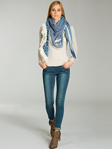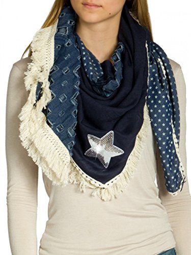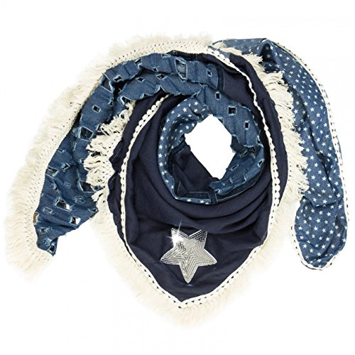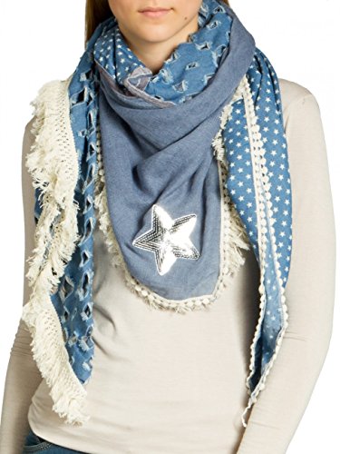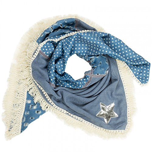 -. Feature : stylischer XXL Schal (quadratisch) für vielen Tragevarianten / kuschlig weiches Material mit hohem Tragekomfort / Länge ca. 130 cm, Breite ca. 115 cm / Jeans-Stoff mit Sterne Print / Destroyed Look; mit Glitzer Pailletten Stern und lässigen Fransen / © CASPAR Fashion Collection