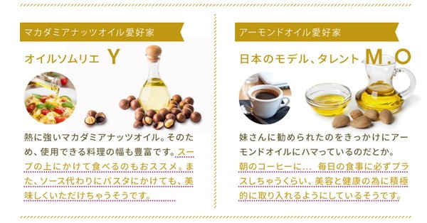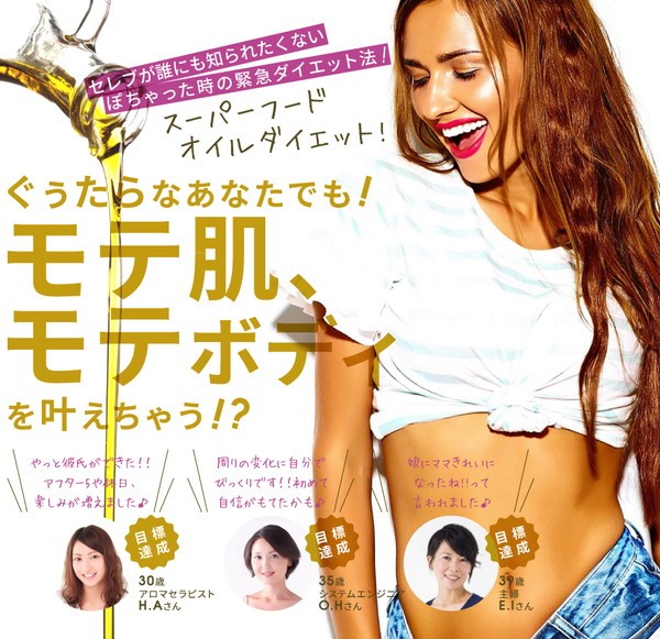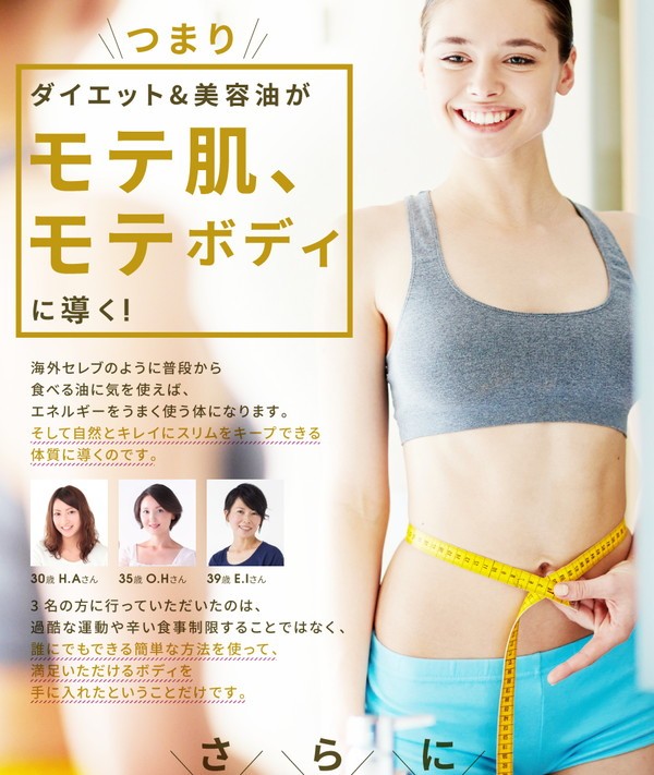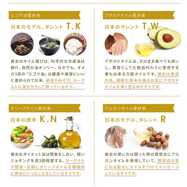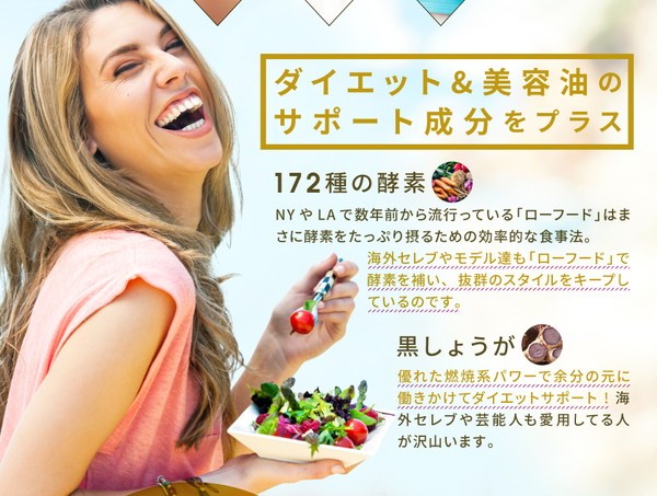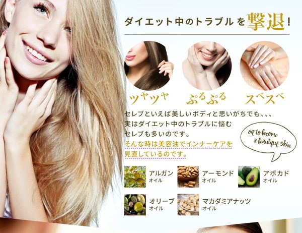 ルーツ・オレンジ・リンゴ・バナナ・大豆<もやし、黒豆>・ゴマ・カシューナッツ・山芋)、ビタミンE含有植物油、アルガンオイル、ブラックジンジャー抽