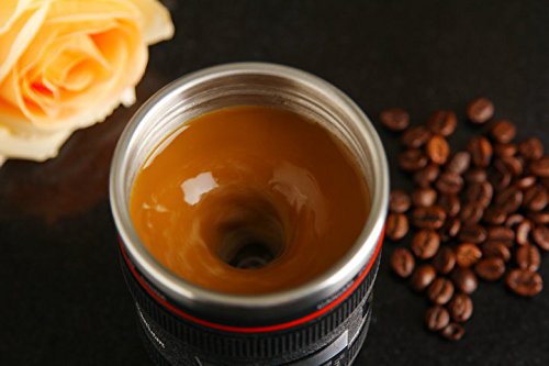 - SELF STIRRING CAMERA LENS TRAVEL COFFEE MUG / Thermos / Cup with lid and handle. Perfect for drinking your favorite hot, cool or cold beverages like hot cocoa, tea, energy or sports drinks (and your other drinks) at home, office or to go while traveling.