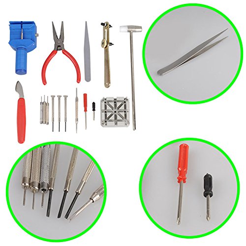 Studio : Watch Helper Publisher : Watch Helper Binding : Watch Product Description This set of 16 watch repair tools includes: 1 watchband link pin remover, 1 watchband holder, 1 spring bar remover, 3 Pin punches, 1 metal and plastic hammer, 1 case knife, 3 slotted screwdrivers, 2 Phillips screwdrivers, 1 case wrench, 1 pair of long nose pliers with side cutters, and 1 pair of stainless steel tweezers 0