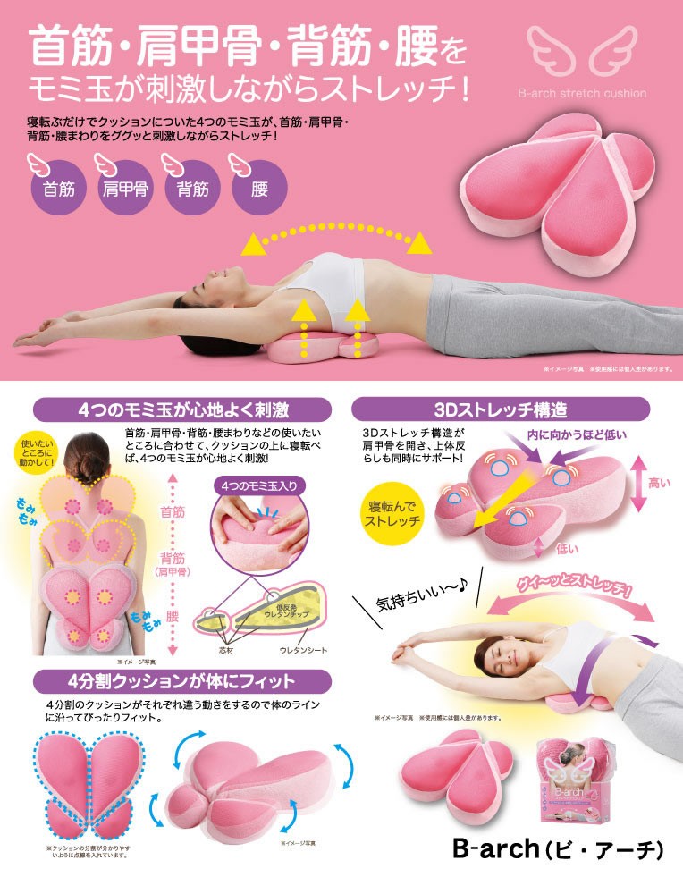 詳細・寝るだけでクッションについた4つのモミ玉が、首筋・肩甲骨・背筋・腰まわりをググッと刺激しながらストレッチ