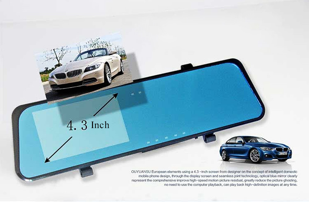 Package Contents: 1 x 1080P Full HD 4.3 inch G-sensor Dual Lens Rearview Camera Car DVR Dash Cam Recorder Video Rear View Mirror, 1 x Car Charger (3m Cable Length), 2 x Mounting Rings, 1 x External Back Lens, 1 x Lens