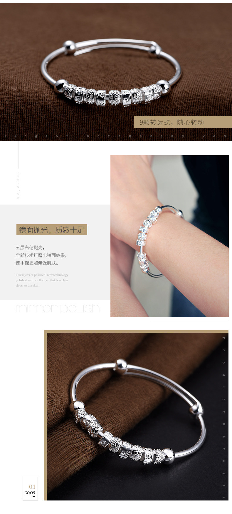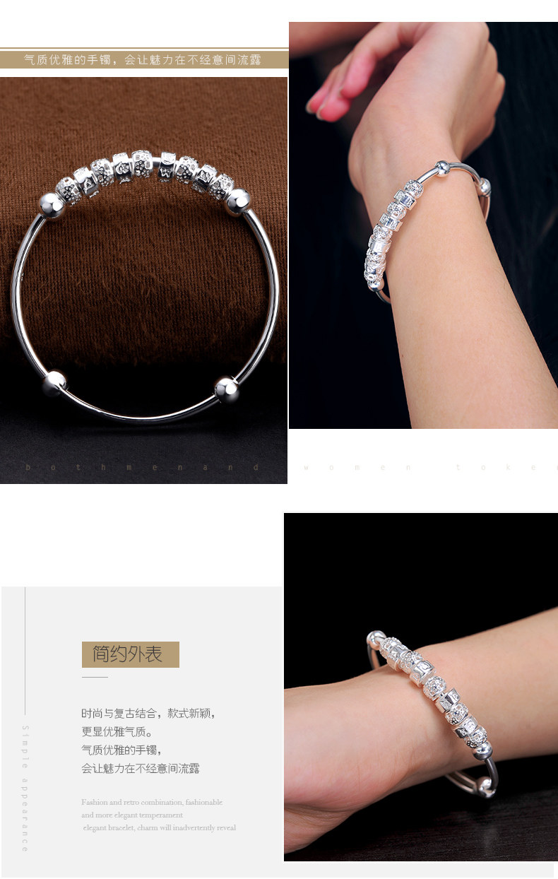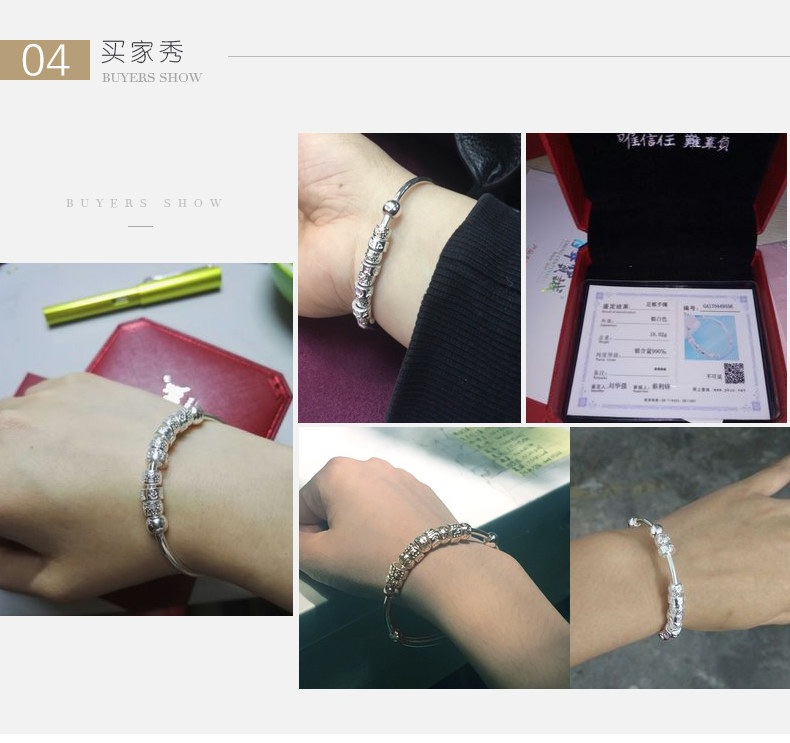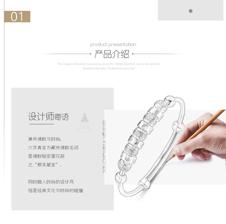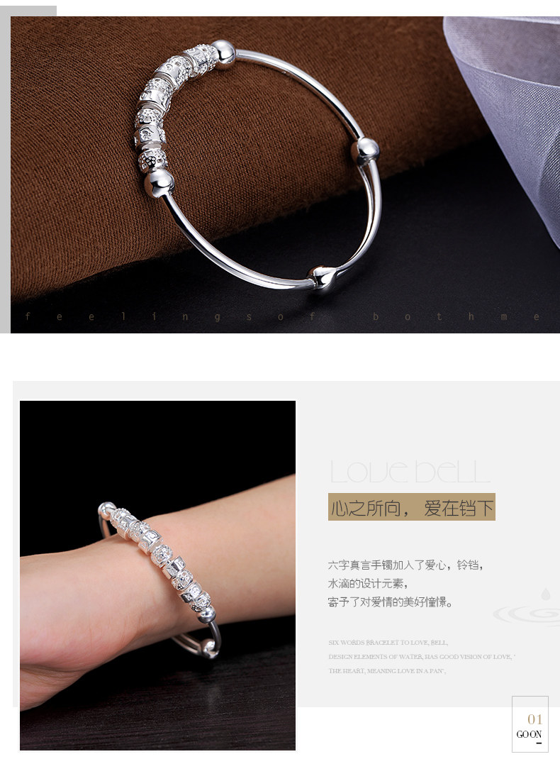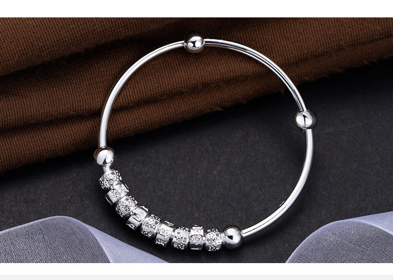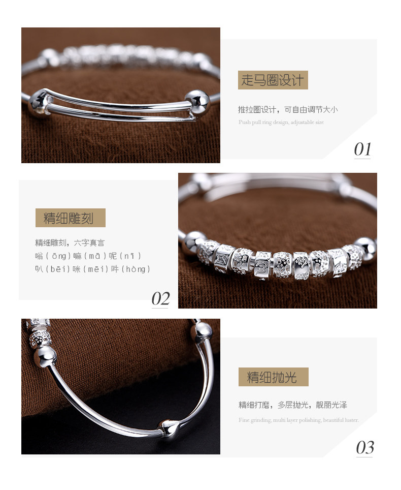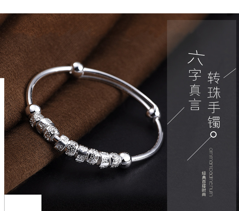 宝诚六字真言足银手镯女 时尚日韩心经推拉圆珠手环送女友银饰