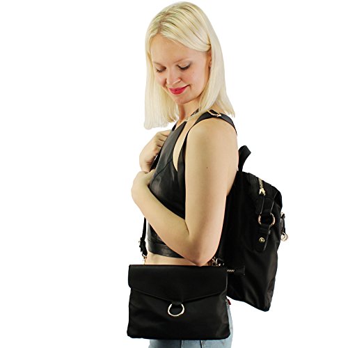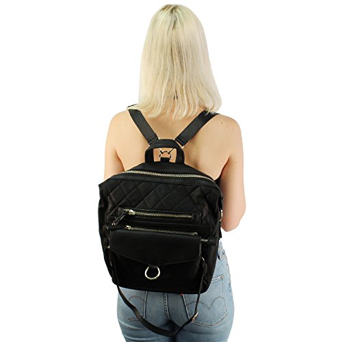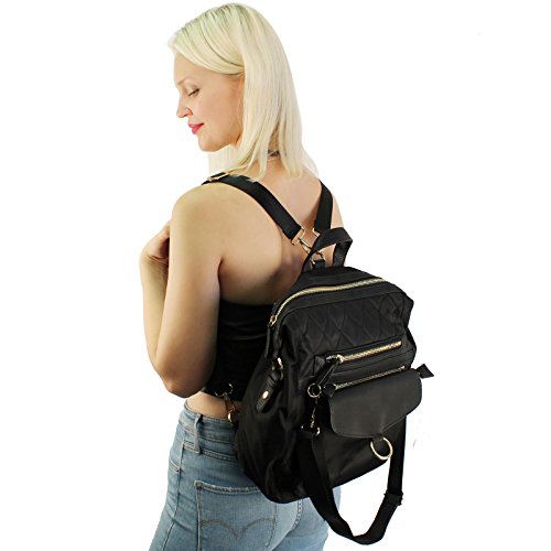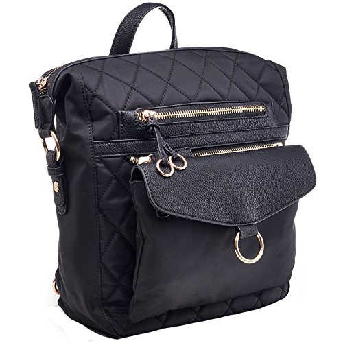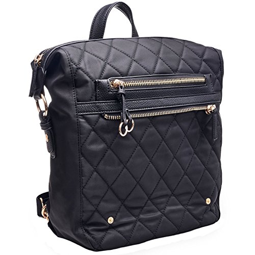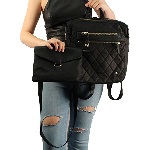 -. Feature : Fabrication: Durable Quilted Nylon with Vegan Leather/ Premium quality 14k gold plated hardware / Full measurement height 14-1/2" x width 10-1/2" x depth 5-1/4" - with adjustable strap - Fits manila folders / Main zipper compartment: 1 interior zipper pocket and 2 interior slide in pocket / Front zipper compartment: 5-1/2" x 8-1/2" x 1" - great for cellphones, compact, makeup, credit card, wallets, cash, / Detachable snap crossbody bag: 7-5/8" x 10" - zipper closure, interior large slide pocket