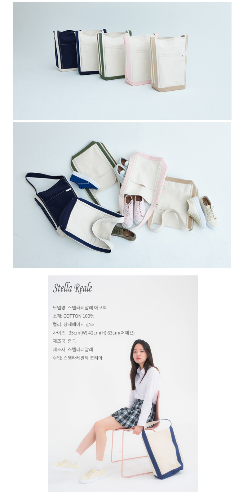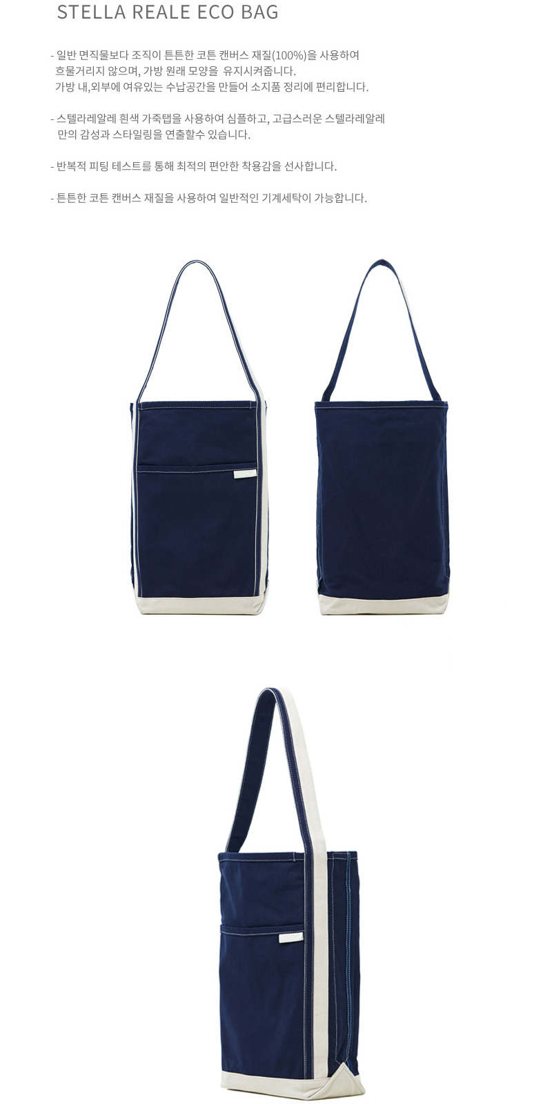 | 스텔라레알레 토트백 - 일반 면직물보다 조직이 튼튼한 코튼 캔버스 재질(100%)을 사용하여 흐물거리지 않으며, 가방 원래 모양을 유지시켜줍니다. 가방 내,외부에 여유있는 수납공간을 만들어 소지품 정리에 편리합니다. - 스텔라레알레 흰색 가죽탭을 사용하여 심플하고, 고급스러운 스텔라레알레 만의 감성과 스타일링을 연출할수 있습니다. - 반복적 피팅 테스트를 통해 최적의 편안한 착용감을 선사합니다. - 튼튼한 코튼 캔버스 재질을 사용하여 일반적인 기계세탁이 가능합니다. - 사이즈 : 35cm(W) 42cm(H) 63cm(어깨끈) |