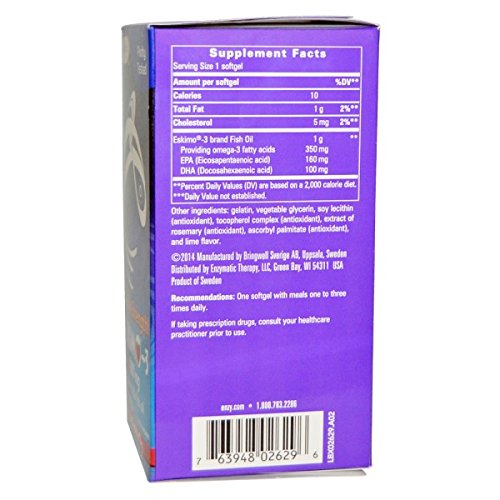Eskimo-3~6 Double-Str 1000 mg 90 gels Dietary Supplement Supplement Facts Serving Size: 1 softgel Servings per Container: 90 Amount Per Softgel: Calories 10-Calories from Fat 10Total Fat 1 gCholesterol 5 mgEskimo-3 brand Fish Oil 1 g-provides omega-3 fatty acids including 140-180 mg EPA (eicosapentaenoic acid) and 87-120 mg DHA (docosahexaenoic acid) Other Ingredients: gelatin vegetable glycerin mixed tocopherols (antioxidant) natural rosemary flavor natural lime flavor soy lecithin and ascorbyl palmitate (antioxidant). Recommendations: One softgel with meals one to three times daily. If taking prescription drugs consult your healthcare practitioner prior to use. Contains no sugar salt yeast wheat gluten corn dairy products artificial flavorings preservatives or ingredients of animal origin. This product contains natural ingredients; color variations are normal.
