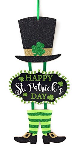 Glittery "Happy St. Patrick's Day" Themed Hanging Welcome Sign with Leprechaun Top Hat and Feet
