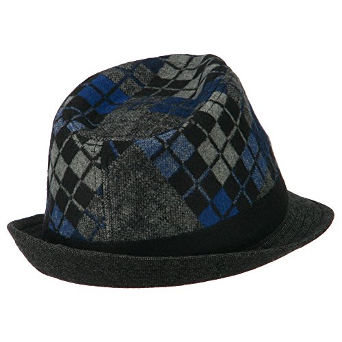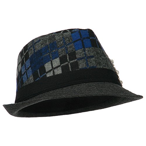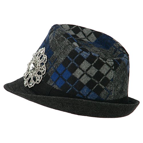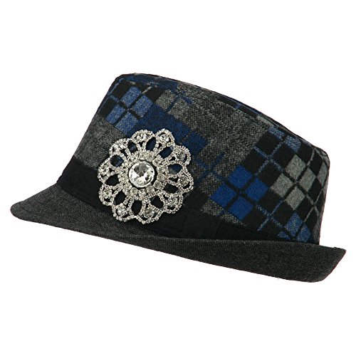 -. Binding : Apparel -. Brand : SS/Hat -. Department : womens -. Feature : Made of 100% polyester. / ONE SIZE fits most ladies, fitting up to 57CM. / Fitted with an inner hat band. / Adult/Female. / Crown measures 4.5 inches deep. -. ProductGroup : Apparel -. ProductTypeName : HAT -. Title : Checkered Fedora with Crystal Flower - Blue
