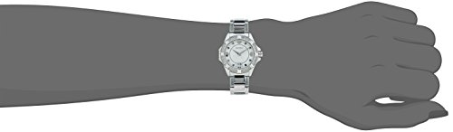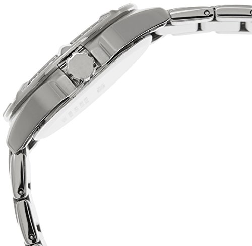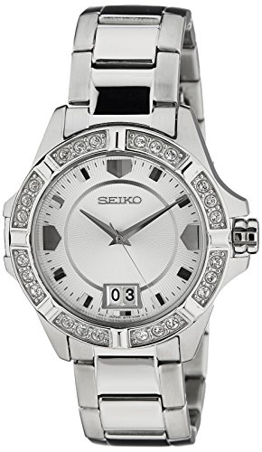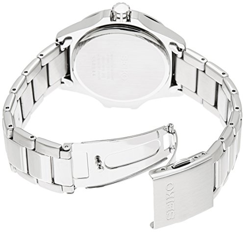 Stainless steel case with a stainless steel bracelet. Fixed bezel. Silver dial with silver-tone hands and crystal hour markers. Minute markers around the outer rim. Dial Type: Analog. Date display at the 6 o'clock position. Quartz movement. Scratch resistant hardlex crystal. Case size: 37.4 mm. Round case shape. Deployment clasp. Water resistant at 30 meters / 100 feet. Functions: date, hour, minute, second. Watch label: Japan Made. Seiko White Dial Stainless Steel Ladies Watch SUR809.