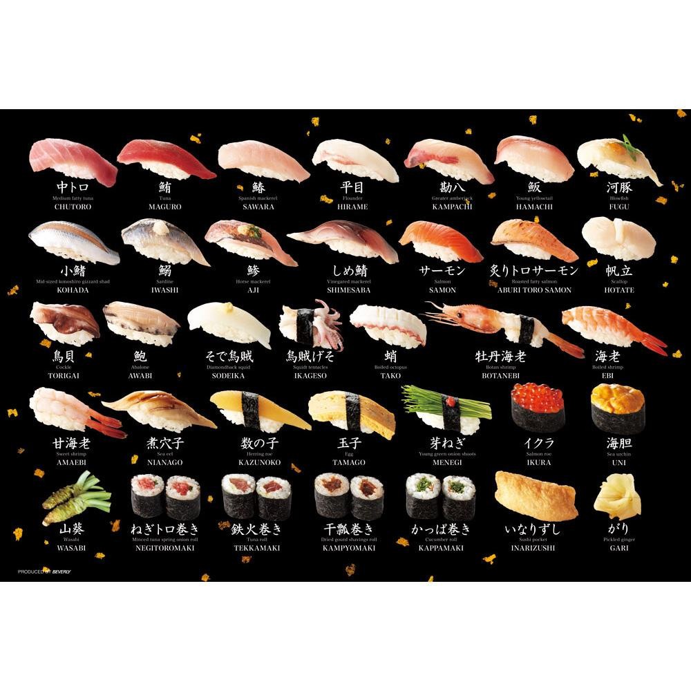 組んでいるだけでもお腹がすきそうな鮨のジグソーパズル。日本語・英語・ローマ字表記で、ネタの種類が書いてあります。ラージピースは通常よりピースが大きいので、初めての方やお子様でも気軽に楽しめます♪ |