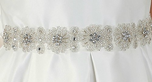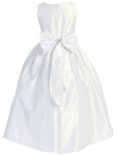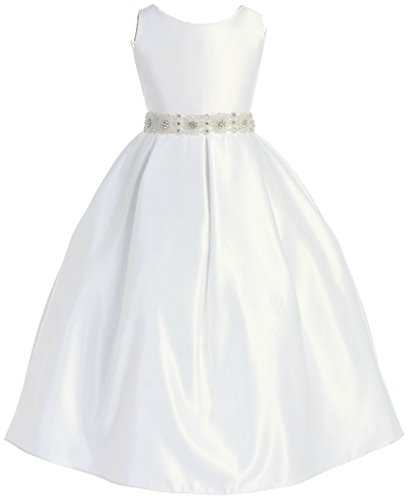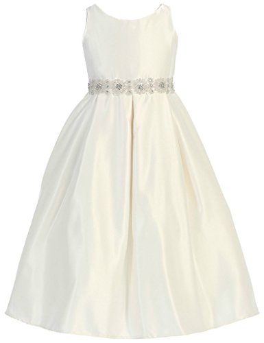 This satin sleeveless style features with beaded floral waistband. Additional netting underneath adds to a fuller look. NOTE: The vendor photo here was photographed with seperate petticoat so it is showing slightly fuller. Zipper closure with sash that ties. An absolutely gorgeous special occasion dress for your little girl. This dress is perfect for birthday parties, fomal events, religious occasions, holidays and more.Feature