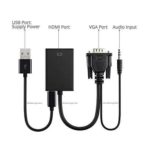 The item has a gold plating plug terminal, and the included AV audio cable to cater for the different audio input. It is only suitable for the device upgrade with the VGA interface through connection HDMI HD indicator.The using environment:-20-65degrees, the relative humidity:5%-95%; This product with the chip, and need external power source, the operating current :170mA, the universal USB cable supply to demand normal work
