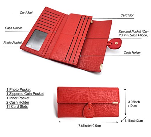 - Capacity:This Leather Wallet organizer has 11 credit card slots, 1 ID or photo Pocket, 1 Inner pockets, 2 Cash Holder and 1 large capacity zipper coin pocket for coins or key,holds all your stuffs easily. Trifold and thin design. Wallet Size: 7.67"L x 3.93"W x 1.18"H inches (19.5 x 10 x 3cm)