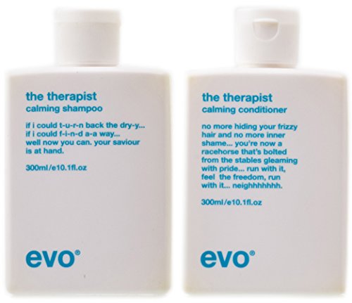 -. Feature : Evo The Therapist Calming Shampoo is a moisturising shampoo to gently cleanse, repair and hydrate dry, frizzy, colour-treated hair. / Hair is gently cleansed; strength, moisture and manageability are restored with dry, frizzy, colour-treated hair. / Evo The Therapist Calming Conditioner is a moisturizing conditioner to repair, hydrate and smooth dry, frizzy, colour-treated hair.