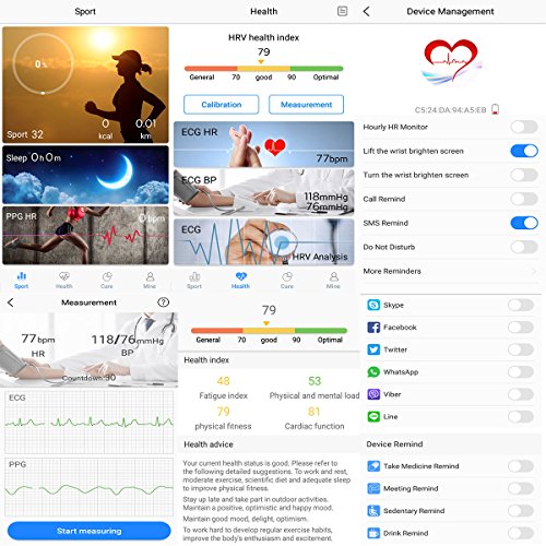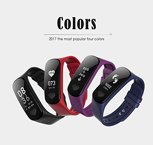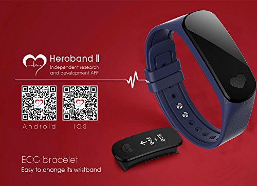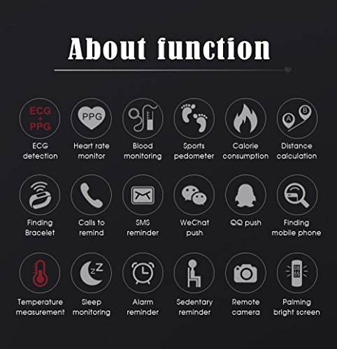 -. Feature : ★ECG MONITOR: Monitor your heart health at any time. Based on ECG monitoring P.R.Inciple, the collection of cardiac bioelectric signals. In the app you can directly check your heart health status.it can not be used as medical use,only a reference for your exercise. / ★Multi-function Smart Bracelet:ECG detection,heart rater monitor,blood montoring,sports pedometer,calorie consumption,distance calculation,finding bracelet,calls to remind,SMS reminder,Wechat push,finding mobile phone,sleep monitoring,alarm reminder,sedentary reminder,drink remind,meeting remind,take medicine remind,remote camera,palming bright screen.note:this fitness tracker doesn't has weather forcase function. / ★How to use measurement in app:Health-Calibration-Measurement(In Heroband II app),After blood pressure's calibrating,user could use the one key measure.please wear arm brace arm horizontally on the desktop,the other band's index finger naturally touch button until the test is completed,after 30 seconds,you could know your Heart rate,Blood pressure,HRV Health Index,Fatigue Index. / ★IP67 WATER RESISTANCE:IP67 waterproof smart bracelet,resistant for dust, rain, washing, sweat and water splash for daily waterproof use only, do not recommend swimming or diving for a very long time when wear bracelet. / ★Compatibility With:The app supports most smart phones with Bluetooth 4.0. Support system: iOS 8.0 or above (iPhone SE, iPhone 5/5S/5C, iPhone 6/6S plus, iPhone 7/7S plus, etc.), Android 4.4 or above(Samsung Galaxy S8, S7/S7 Edge,etc ),great choice for christmas gift,birthday gift.