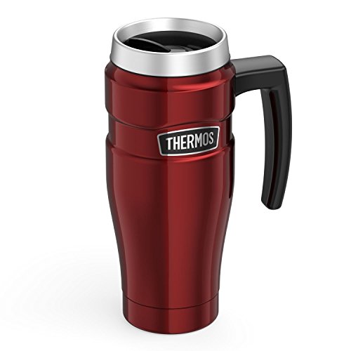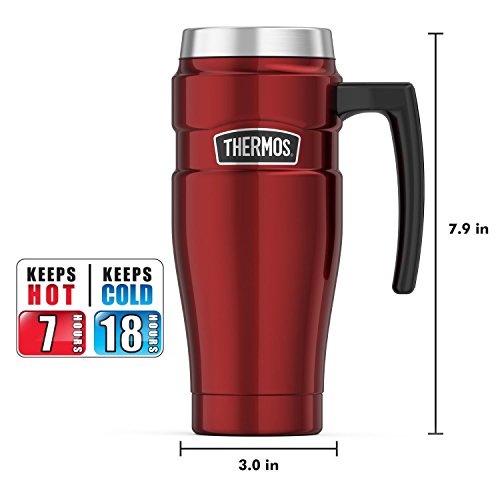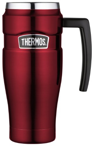 -. Binding : Kitchen -. Brand : Thermos -. Feature : Ultra-durable travel mug with handle for hot and cold beverages; 16-ounce capacity / Unbreakable stainless steel interior and exterior / Leak-proof Drinklock sealing lid / Stays cool to the touch with hot liquids and is condensation-free with cold / Hand wash only -. Label : Thermos, L.L.C. -. Manufacturer : Thermos, L.L.C. -. Model : B002PY7AYI-PARENT -. ProductGroup : Kitchen -. ProductTypeName : KITCHEN -. Publisher : Thermos, L.L.C. -. Studio : Thermos, L.L.C. -. Title : Thermos Stainless King 16-Ounce Travel Mug with Handle