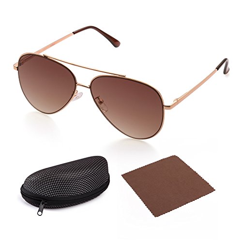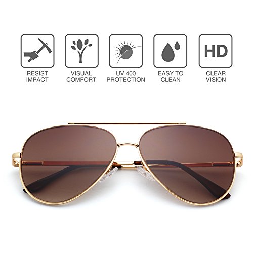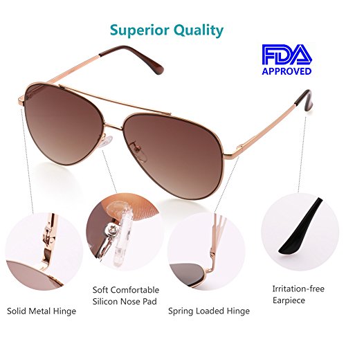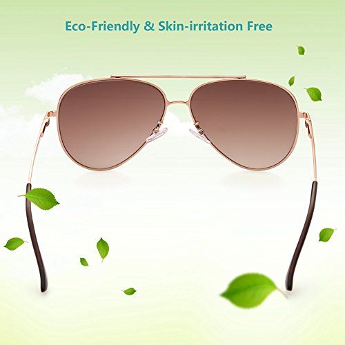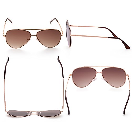 Gold metal frame and flat cool brown gradient sunglass lenses for latest fashion trends; adjustable silicone nose pads and irritation free earpiece ensures maximum comfort