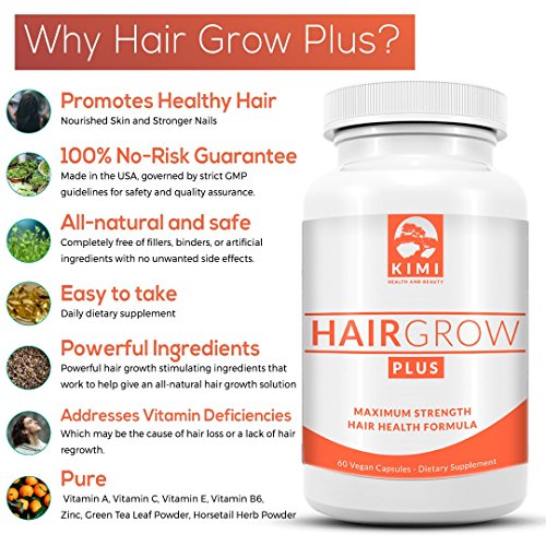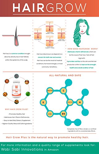 The importance of a full head of hair cannot be understated. It directly influences your career, your love life and your self-esteem. So do yourself a favor and support your hair so you can be your best self! Hair Grow Plus was created to do just that, help you be your best self. We have created a unique hair growth vitamin formula that has 13 active ingredients that are important to your hair health. Hair Grow Plus can be used on hair loss caused by: Hormonal imbalance, menopause, stress, hereditary hair loss, thyroid issues, alopecia areata. androgenic alopecia, female & male pattern baldness, immune system problems, infections, allergic reactions, surgery, excessive styling, hair product overuse, skin conditions of the scalp & nutritional deficiencies. With 5000mcg of Biotin, we provide 2 capsules that helps you notice more nourished skin and stronger nails in addition to your new vibrant hair. We insist the risk is on us, so simply try Hair Growth Plus for 90 days and if you do not see the results you want then we will gladly refund your money, no questions asked and no hoops to jump through, ever.Feature