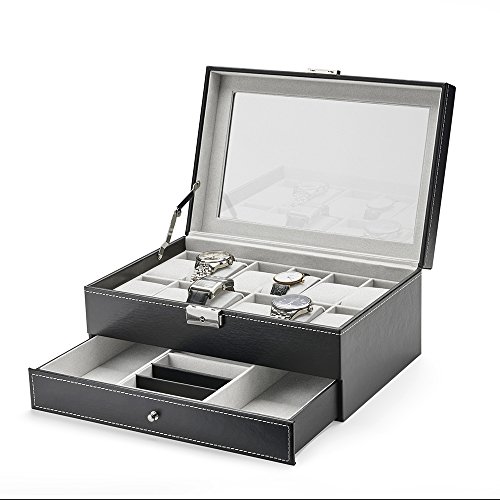 TWING 12 Slot PU Leather Watch Box Organizer Mens Watch Jewelry Display Case with Lock -Black
