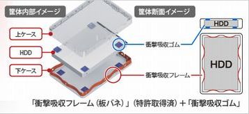 ???衝撃吸収フレーム(板バネ)とトータル8個(2個×4角)の衝撃吸収ゴムが内蔵ドライブをしっかりガードします。