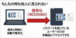 ???HDDの紛失・盗難など、もしもの時にも情報漏洩の心配があり ませんので秘密を守りたいビジネス文章などのデータの持ち運びも安心です。暗号化方式には「AES256bit」を採用。※Windowsのみ対応