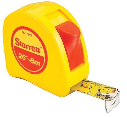 Starrett KTS1-26ME-N ABS Plastic Case Yellow Measuring Pocket Tape, English/Metric Graduation Style, 26' (8m) Length, 1" (25.4mm) Width, 0.0625" Graduation Interval