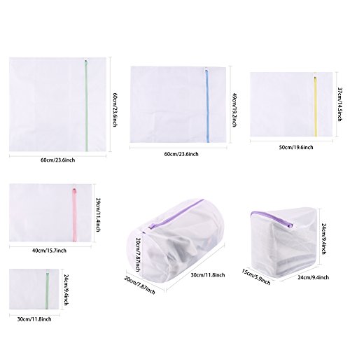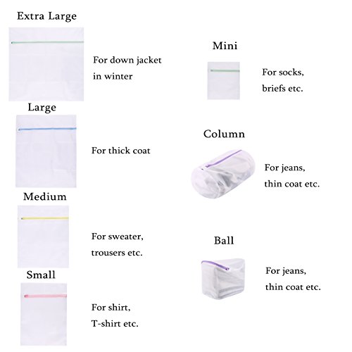- Package includes: Set of 7 mesh laundry bags. Size: Extra large(23.6"x23.6"),Large(23.6"x19.2"),Medium(19.6"x14.5"),Small(15.7"x11.4"),Mini(11.8"x9.4"),Column(7.87"x7.87"x11.8"),Ball(5.9"x9.4"x9.4")