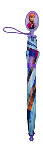 Brighten up a rainy day with this adorable Frozen umbrella! Features colorful graphics of Elsa and Anna, and a handle with Anna on one side and Elsa on the other. Measures 20 inches long with a 25 inch diameter canopy. Velcro closure and a pink nylon wrist strap. A cute and colorful way to stay dry or block the sun when shade is needed!