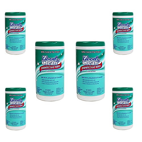 -. Brand : Good & Clean -. Feature : Good & Clean Disinfectant Wipes keep your home clean by killing 99.9% of household bacteria in just 15 seconds / Fresh scent Clean any room in your house Cleans and disinfects in one easy step / Helps prevent the spread of gems Kills cold & flu virus Safe for use on most surfaces / Re-closable lid 75 wipes per container Wipes measure 7" L x 8" W / Bleach-free Alcohol-free Made in USA -. LegalDisclaimer : Help keep household germs at bay with the Good & Clean Disinfecting Wipes, which kill 99.9% of bacteria, even the cold and flu virus, in just 15 seconds. -. ProductGroup : Kitchen -. ProductTypeName : KITCHEN -. Title : Good & Clean 75-Count Disinfectant Wipes in Fresh Scent (6 pack)