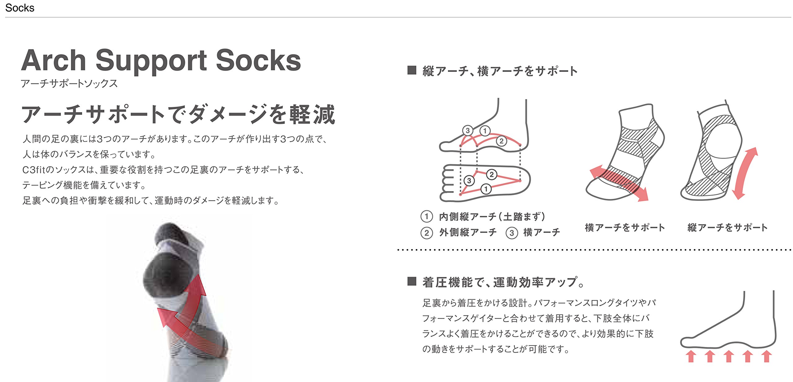 "C3fit" works at the stage pressure <Compression> Organizes the body function <Conditioning> Comfortably supports every movement <Comfort> These three "C" fit perfectly with the movement of the body.