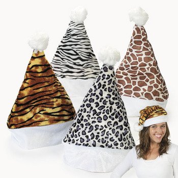Set of 4 - Velour Animal Print Santa Hats - Zebra, Leopard, Giraffe and Tiger - Great stocking stuffer or Christmas party favor