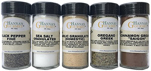 -. Binding : Misc. -. Brand : HANNA'S GOURMET -. Feature : EACH ITEM PACKED IN 4 fl. oz. GLASS JAR / ALL NATURAL / 100% PURE / STAR K CERTIFIED -. Label : JR SPICE CO -. Manufacturer : JR SPICE CO -. ProductGroup : Grocery -. ProductTypeName : GROCERY -. Publisher : JR SPICE CO -. Studio : JR SPICE CO -. Title : GOURMET SPICE GIFT SET - A STEP ABOVE (5 PACK)