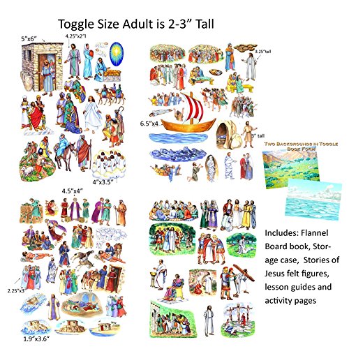 -. Feature : This set is the small/ toggle size. An average adult is 2-3.5" tall / Set includes: Birth, Miracles, Parables and Crucifixion & Resurrection of Jesus, 11"x17" Toggle Book/Flannel Board, storage case, lesson guides/activity sheets and bonus / Toggle board folds in half and easily stores on a book shelf. / Made in the USA. Felts are precut and ready to use. / Choking Hazard- small parts. Not for children under 3