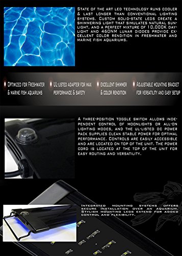 - Feature : 24 Inch LED High Efficiency Lighting System With Lunar LEDs For Aquariums And Terrariums, Freshwater Tropical Fish, Marine Fish, Reef Fish, and Corals! / Lamp Type: H.E. LED Lamps, 10,000k & 460NM Blue. Input Power: 120V / 60HZ. Max Draw 14.50W / Optimized for freshwater aquariums and marine aquariums. UL-Listed adapter for max performance and safety. Excellent shimmer and color renditon. Adjustable mounting bracket for versatility and easy setup / Easy to use: The Three-Position toggle switch allows independent control of moonlights or all-on lighting modes and UL-Listed DC power pack supplies clean stable power for optimal performance. Contraols are easily accessible and are located on top of the unit. The power cord is located at the top of the unit for easy routing and versatility / State Of The Art LED Technology runs cooler and last longer than conventional lighting systems. Custom solid-state LEDs create a shimmering light that simulates natural sun-light, and perfect mixture of 10,000k Day-Light and 460NM Lunar diodes provide excellent color rendition in freshwater and marine fish aquariums. The polish plastic housing makes a bold statement with its sleek and compact design. The gloss black finish is not only aesthetically pleasing, but is easy to clean and protects surface from contaminates