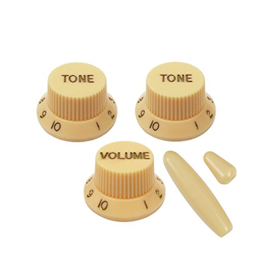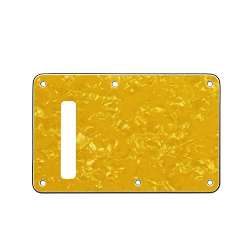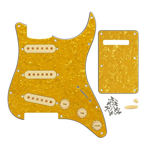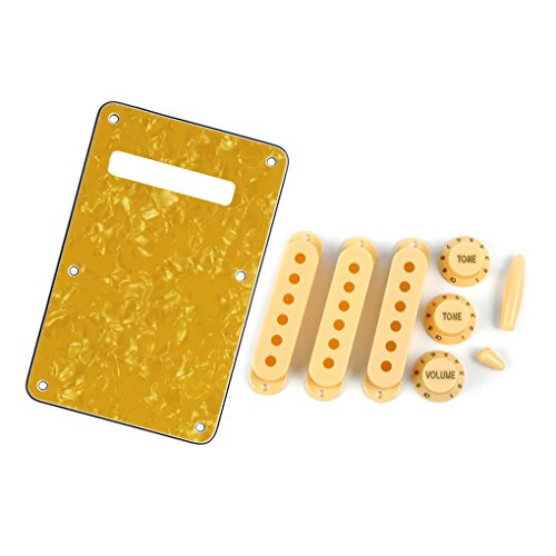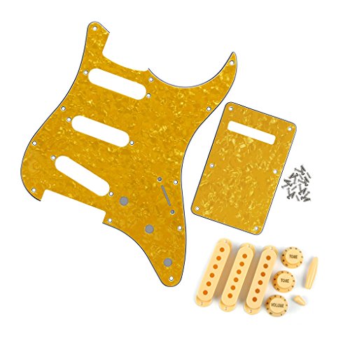 Product Description Feature:* Set of gutiar pickguard, back plate, pickup covers, knobs and tip for Fender Style Strats Standard Stratocaster Modern Style Gutiar or similar replacement.* All materials are environmentally friendly, thermostability, no smell. Multi-layer plates are pressed under high temperature and pressures, to make them close integration between each layer, will not appear curly, deformation, or separation of different layers.* Two layers of protective films on the front of pickguards, anti-scratch to protect the guitar.Specification:* Item: Guitar pickguard Guitar back plate 50/52/52mm Pickup covers 2T1V knobs 5 Way switch tip.*Pickguard: SSS(single/single/single coil) style pickguard; 11 screws holes in the side of pickguard.* Back Plate: L- 145mm, W- 93mm.* Material: Pickguard and Back Plate is made of 4Ply PVC(1Ply Pearl Plate and 3Ply PVC); Guitar Parts: Plastic PVC.* Pickup covers: 50/52/52mm pole piece holes for single coil pickups.* Knobs: 2pcs Tone and 1piece Volume knobs* Swith Tip: for a 5 Way Strat Style Guitar switch or similar.* Pickguard Color: Yellow Pearl; Guitar Parts' Color: Cream, will be sent the same like the pictures showed.* Note: Item's color might be different from the picture because of the aberration. Package Includes:1 x Pickguard1 x Back Plate3 x Pickup Covers2T1V Knobs1 x 5 Way Switch Tip1 x Bar Tip25 x Screws 0