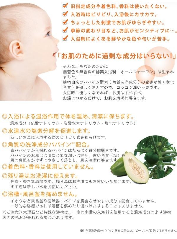 | ●入浴による温浴効果で体を温め、清潔に保ちます。 | | ●水道水の塩素分解を促進します。 | | ●角質の洗浄成分パパイン配合。 | | ●着色料・香料は使用していません。 | | ●浴槽・風呂釜を傷めません。残り湯はお洗濯に使えます。 |