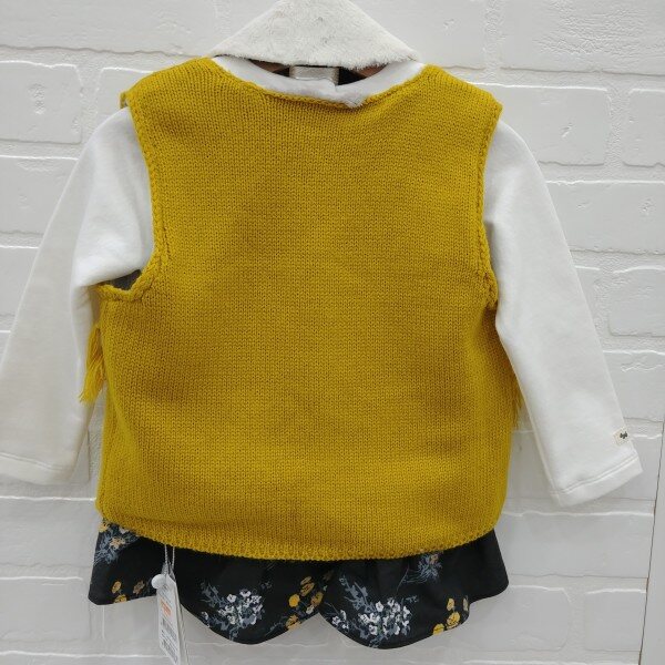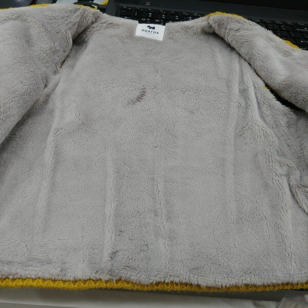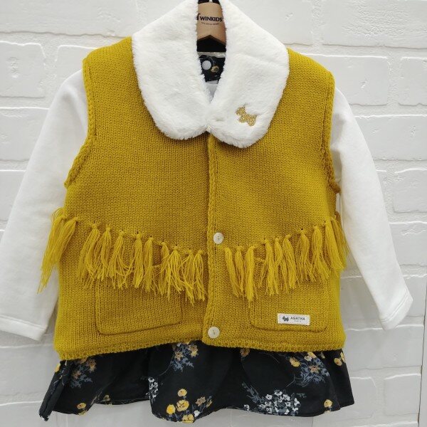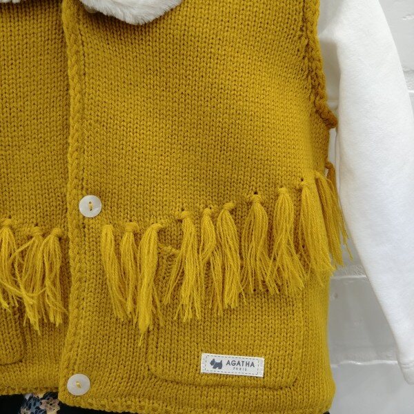 수술장식으로 포인트를 준 플레인 조직의 니트조끼, 부드러운 퍼 안감을 넣어 보온성을 높여준 스타일.