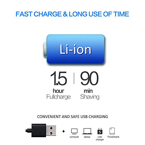90 MIN CORDLESS SHAVING:The state-of-the-art Li-Ion battery never loses performance and fully recharges in 1.5 hour, that means months of normal usage between charging .lithium ion has no 'memory' issues so your battery will always take a full charge
