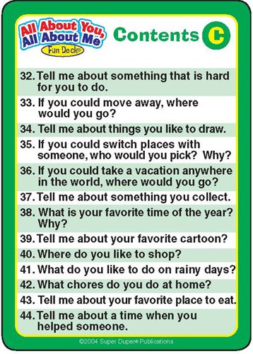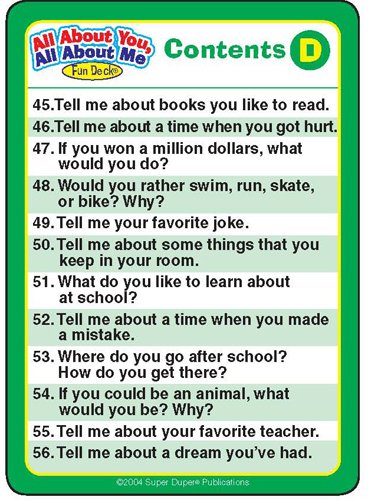 Here's a fun way to learn about others and talk about themselves. The deck has 56 question cards with fun illustrations. Game ideas, too!
