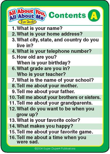 56 illustrated cards (2 1/2" x 3 1/2") introduce basic questions ("How old are you?") and open-ended questions ("Tell me about your friends.")