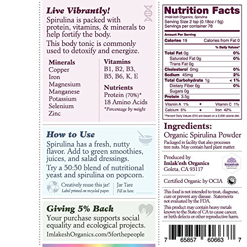 -. Binding : Grocery -. Brand : Imlak'esh Organics -. Feature : ALGAE -- Spirulina is a powdered blue-green freshwater algae, and one of the most nutritionally dense foods on the planet! This ancient superfood contains a full spectrum of vitamins and minerals to fortify and nourish our bodies. / BENEFITS -- Spirulina contains 65% protein by weight, all essential amino acids, vitamins A, K and B, iron, and high levels of anti-oxidants and carotenoids. Renowned for boosting energy, immune system function and supporting cardiovascular, eye and brain health. / SOURCE -- Sustainably cultivated in sP.R.Ing-water pools and stringently tested for over 40 pesticides, heavy metal and contaminants. Super clean, pure Spirulina! / USE -- Add to smoothies and salads or mix into juice. For the really adventurous, try in baking! / || 100% Certified Organic || Raw || non-GMO || Vegan || Gluten free || -. Label : Imlak'esh Organics -. LegalDisclaimer : Statements about this food have not been evaluated by the Food and Drug Administration. This product is not intended to diagnose, treat, cure, or prevent any disease. -. Manufacturer : Imlak'esh Organics -. ProductGroup : Grocery -. ProductTypeName : GROCERY -. Publisher : Imlak'esh Organics -. Studio : Imlak'esh Organics -. Title : Imlak'esh Organics Spirulina