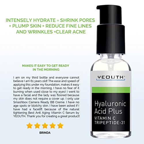 Experts recommend Yeouth Hyaluronic Acid Plus with Vitamin C and Tripeptide-31 : HA Plus is a luxurious, velvety anti-aging skin care serum that glides over your skin and penetrates deep to tighten, lift and plump. Great for all skin types. Use on face, neck, décolleté and the back of aging hands.