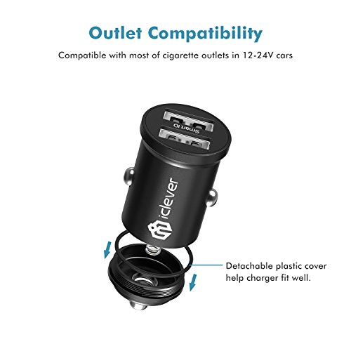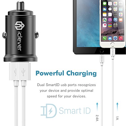 iClever SmartID Technology With SmartID technology, the charger automatically recognizes your device and adjusts max charging current efficiency to your device, thus reaching optimal speed to save your time. Max 4.8A output accross dual usb ports - Meaning you can charge two device simultaneously at full speed. No more backseat squabbles on who gets to charge their phone first.