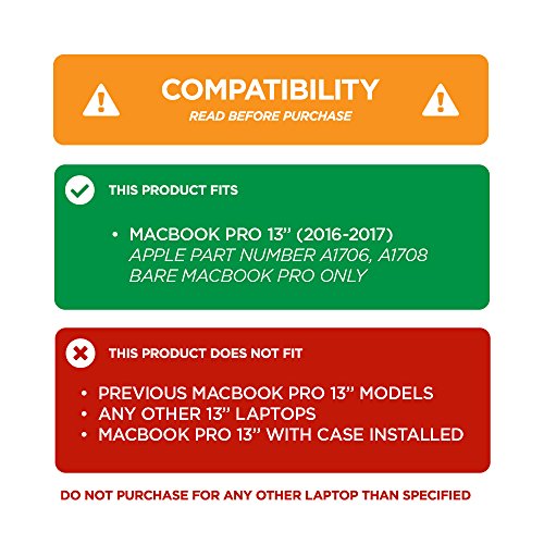 Form-fitting design that fits snugly to your MacBook (Fits 2016+ MacBook Pro 13", A1706, A1708 ONLY). Does NOT fit any other laptops or older MacBook Pros. Does NOT fit MacBook Pros with case installed.