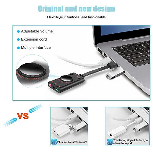 - 【Mixer FUNCTION】Mixer Function can adjust the output electronically level. Functional keys including microphone-mute, speaker-mute and volume-up/down roller. The mini LED indicator and surround sound can improve the level of gaming audio. Two headset jacks with one microphone jack can satisfy all your needs for an external sound card adapter.