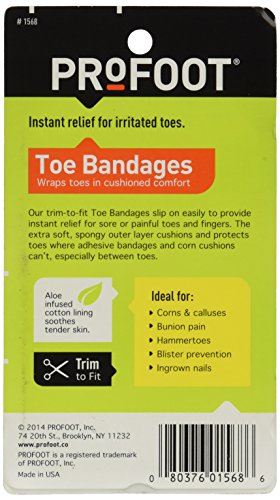 -. Binding : Health and Beauty -. Brand : Profoot -. EAN : 0767644032124 -. Feature : Protect and soothe toes with soft slip-on bandages / Wraps toes in cushioned comfort / Conform to any size or shape needed, and stay in place / Comfortable in all types of shoes -. IsAdultProduct : 0 -. Label : Profoot Care -. Manufacturer : Profoot Care -. Model : 1568 -. MPN : 1568 -. NumberOfItems : 1 -. PackageQuantity : 1 -. PartNumber : 1568 -. ProductGroup : Health and Beauty -. ProductTypeName : HEALTH_PERSONAL_CARE -. Publisher : Profoot Care -. SKU : 0316164 -. Studio : Profoot Care -. Title : PROFOOT Toe Bandages, One Size, 3 bandages -. UPC : 767644032124