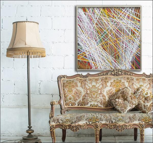 カラフルにハンドペイントされたキャンバスをリッチなフレームにセットしたモダンアートです。