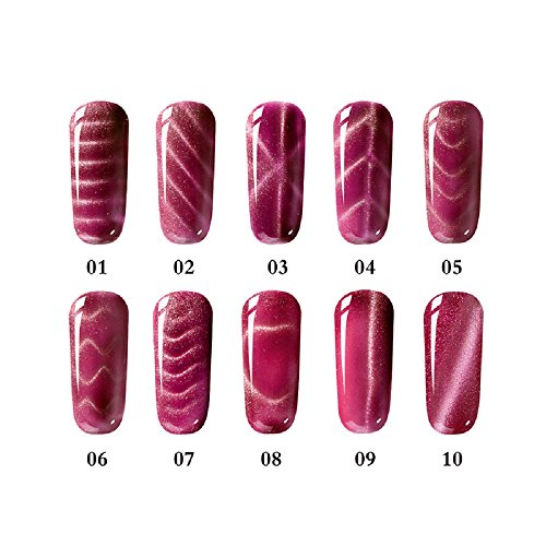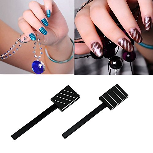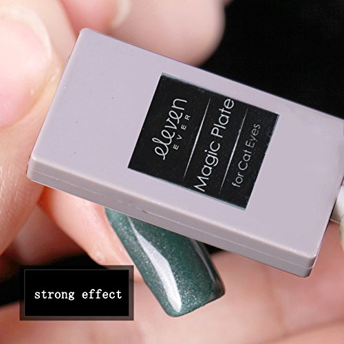 How to Use to make the effect: 1. Apply base oil first cure it 2. Apply a thick layer of cat eye gel nail polish, work quickly, the polish dries fast so you need to get the magnet stick over the wet polish ASAP. 3. Place the finger under the magnet plate for 15 seconds or use the pen draw the pattern you like. 4. Apply Top Coat and cure it. 0