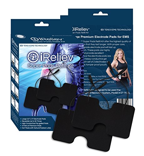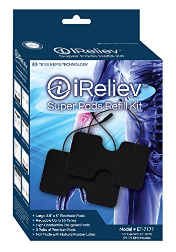 From the Manufacturer: The iReliev Super Pads offer the highest quality of reusable gel so that they last longer. With proper care, the premium grade electrode with last up to 30 uses each. These pads are highly conductive and provide excellent dispersion for large muscle groups to help create muscle contraction. Since the electrodes pads are pre-gelled, no messy conductive gel is required. Each pair of 2 electrodes come is sealed in poly tamper proof pouch.and,Latex Freeand,Self Stick Durableand,Reusable up to 30 Timesand,Flexible Layer Contours Better on Your Bodyand,Full Coverage Wire Connector for Full Dispersionand,Premium Cloth Backing is Comfortable, Durable Safe Dimensions of Electrodes: 3.5 x 5 Approximately iReliev Super Pads Refill Kit Comes Compete with:and,3 Pairs of Reusable Electrode Pads (6 Pads)and,Feature
